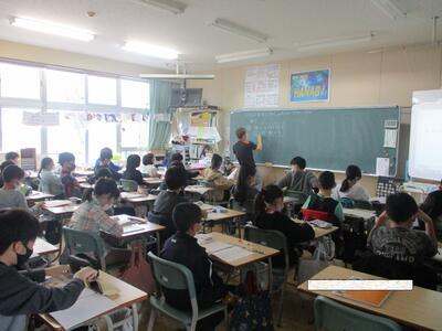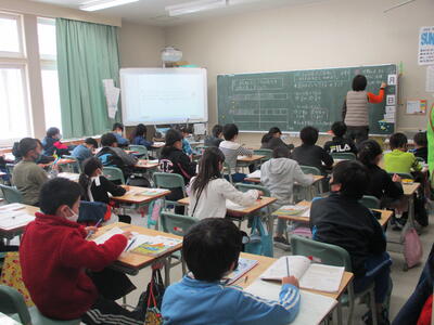 算数:電子黒板を使いながらお友達が発表しているところです。とても上手にできましたよ。