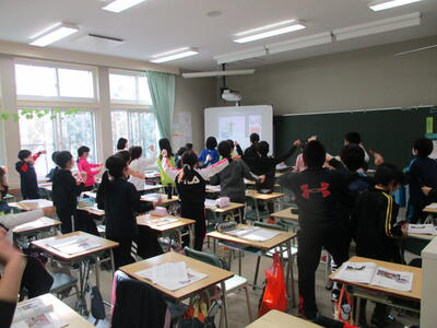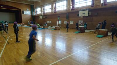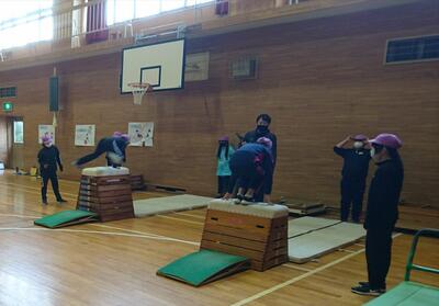 今日の体育は、サッカーと跳び箱でした。グラウンドでは4つのコートでサッカーの試合をしていました。暖かい天候でしたので、ボールを追いかける足取りも軽いようでした。体育館では、跳び箱の学習でした。技を決めようと集中して取り組んでいる様子が見られました。
