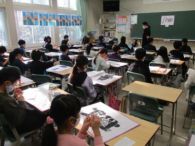 授業参観の後は、廊下の作品も鑑賞してくださいました。「すごいなあ」「じょうずだね」という声が聞こえていました。
