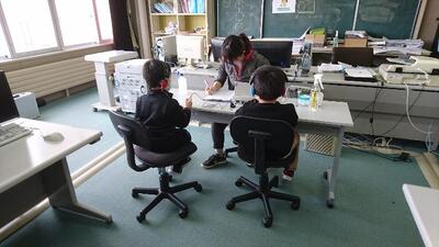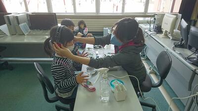 例年より遅い時期の実施となりましたが、1年生の視聴力検査が終わりました。一人ずつ、見え方、聞こえ方の検査をしました。見慣れない検査機器にちょっと緊張気味の1年生もいたようです。写真はパソコン室で行った聴力検査の様子です。