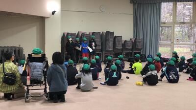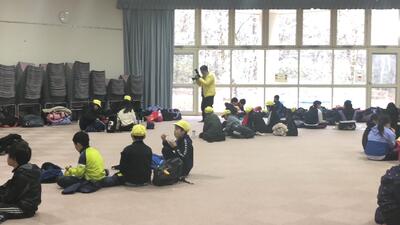 日高青少年自然の家に到着しました。さっそく入館式を行い、生活の約束を確認しました。このあと入館し、室内で昼食です。雪がチラチラ舞っています。