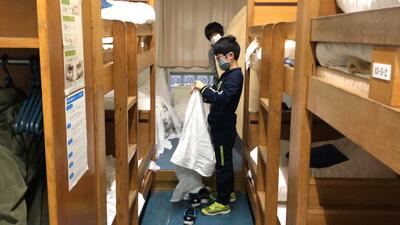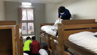 昼食後はいよいよ宿泊棟へ。がんばってベッドメイクをし、すぐさま午後の活動へ。