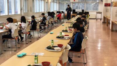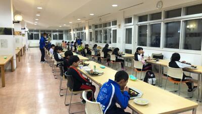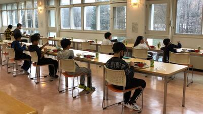 今日は、6年生の給食の様子を紹介します。感染症対策で静かに食べていました。おしゃべりはマスクをつけて休み時間にしようね!