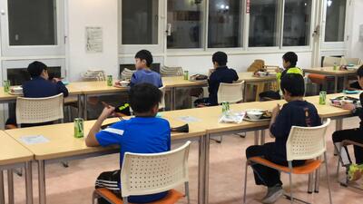夕方5時から8時30分までは、クラスごとに時間をずらしての、夕食、入浴、自由時間、学習時間です。夕食は、一列に並んで、静かに食べます。ルールを守って美味しくいただきました。どの場面でも班の友達と協力しながら立派に過ごしています。
