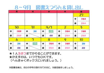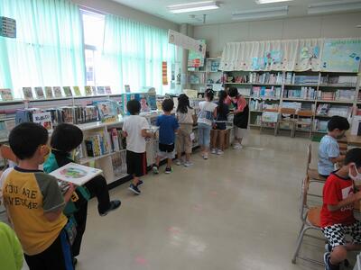 夏休みに借りていた図書の返却期間が終わり、今日から貸し出しが再開しました。緊急事態宣言の期間となったため、割り当てが変更になっています。今日の中休みは1年生の割り当てでした。