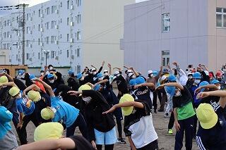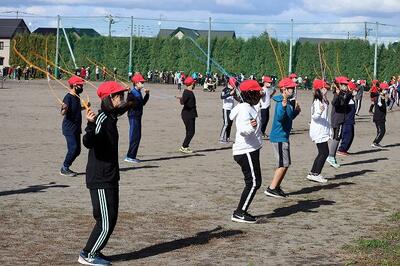 開会式、ラジオ体操の後、表現種目です。内容は、なわとびとリズム表現を組み合わせたもので、何度も何度も練習を重ねてきました。全力を出し切り、すがすがしい笑顔が見られました。
