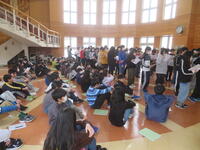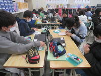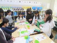6年生は今、勉強やそれ以外でも、主にまとめの活動を行っています。算数の学習では、これまでの復習問題や応用問題に挑戦しています。応用問題はなかなかすぐには答えが出せず、班で話し合いながら解いていました。家庭科では、雑巾の制作にとりかかっています。秘密の計画があるようです。歌声も、心を合わせながら聴いている人に感謝の思いが伝わるように練習に励んでいます。