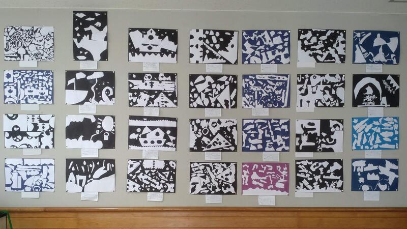 2年生の作品は図工「はさみのアート」。自由に画用紙を切った後に、できた形から想像して作りました(絵に表す活動)。発想豊かで楽しい作品がいっぱいです。