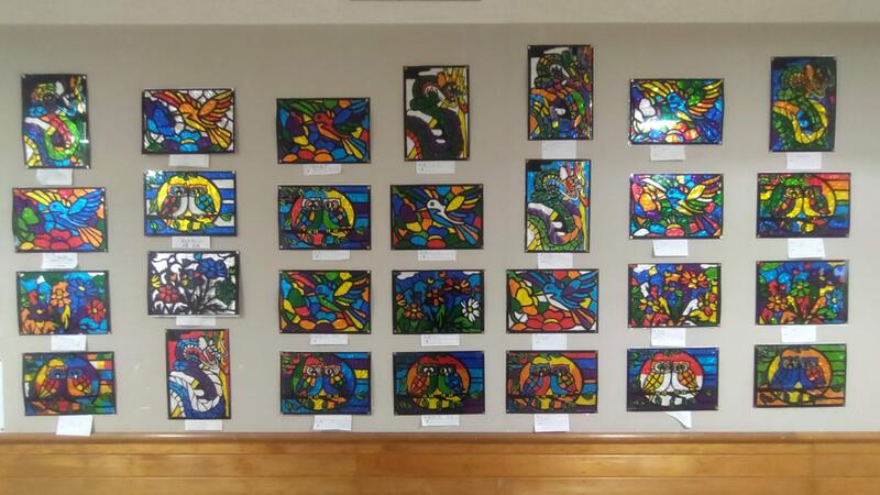 4年生の作品は図工「光とかげから生まれる形」、カッターを使って、「全集中」で作業を進めました。黒い台紙にカラーセロハンを貼りつけ、だんだん絵が現れるのを楽しみながら作りました。
