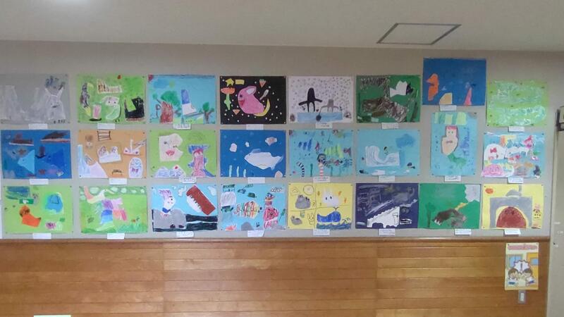 1年生の作品は、「いろいろな かたちの かみから」。いろいろな生き物などを作って、色画用紙に貼り付けました。カラフルで楽しい作品がいっぱいですね。