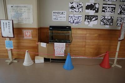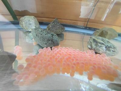 2年生の学習のため、サケのふるさと千歳水族館から、サケのたまごがやってきました。休み時間になると、子ども達が水槽の中をのぞいています。