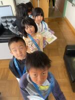 本日校長室にかわいいお客様が来ました。1年生が6~7人ずつ班に分かれて校長室など学校内をめぐる学校探検の学習です。