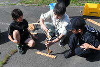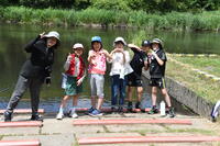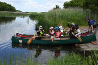 7月10日と11日は小学校5・6年生の宿泊学習です。1日目は出発式のあとに学校からリアカーで駒里会館に荷物を運びます。その後はカヌー体験でした。2艘のカヌーを合体させ小学校5・6年生と先生方2名で力を合わせてこぎ、2km先のゴールに到達しました。その後キウス周堤墓群での学習となりました。縄文時代のお墓が発見された経緯や大きな周堤墓について学びました。昼食を挟んで、縄文時代の生活についても学びました。次の目的地は埋蔵文化(財)センターです。ここでは千歳市で発見された縄文時代の遺跡や土器について学び、勾玉づくりや火起こしをしました。この後は食事作りと星空観察が待っています。