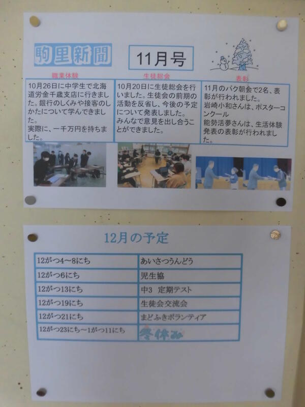 また、中学校生徒会では、「駒里新聞」が発行されました。