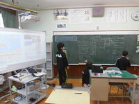 中学2年生の授業では、学習リーダーが授業を進めます。調べたことをフォームにまとめ、電子黒板に映し出します。予め配付したワークシートに則って、主体的に学習する姿が見られます。