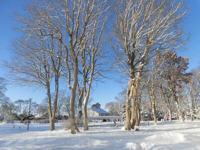 今朝の駒里は、昨晩からの積雪で周囲が真っ白の状況です。天気は快晴、やや冷え込んでいますが、日差しの温かさを感じます。