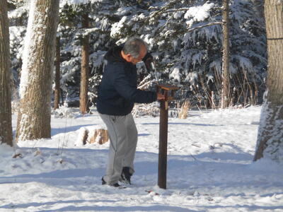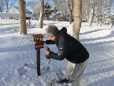 本校周辺には、たくさんの動物が住んでいます。その中でもエゾリス(本校では「みまもりす」と呼んでいます)が、本校教職員の巧みな技術で、2つ目の「えさ箱」が完成しました。早速、えさを入れてみました。