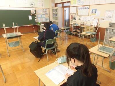 今日からは中学生のみの生徒たちが、朝、バスで登校。中1・2年生は部活動の前の時間に学習を進めます。