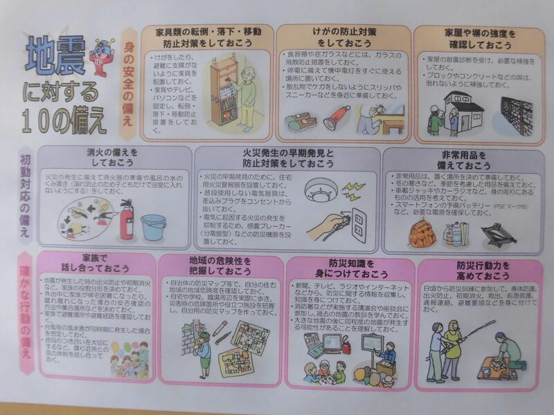 東京消防庁に直接お電話して許可を得て、今回の集会・ホームページで活用させていただきました。現在、過去30年間にて6回の大地震を経験しました。今回を含めると7回目です。北海道では、6回のうち2回(南西沖、胆振東部)であり、昨年6月にも千歳で震度5弱の地震を経験しました。いつどんな時に起きるかわからないのが自然災害です。地震が起きる前に備えておくことも大切と思い、「10の備え」を掲載しました。是非とも、心にとめておきたいものです。