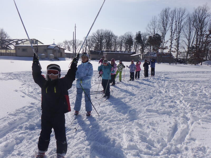 今日は初日。グラウンドを自分のペースで歩いたり、競走をしたり、少しだけ林間を歩いたりしました。最高の天気で、とても気持ちの良いスキー学習でした。