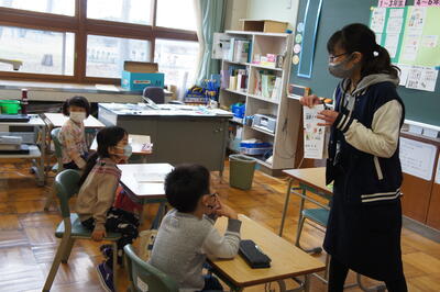 体力向上に向けての取組です。体力テストの種目を中学生が一種目担当し、やり方や効果的なトレーニング法を調べ、小学生に教えました。今現在の自分の体力が、日頃のトレーニングでどのくらい向上するのか楽しみですね。中学生は、掲示物や実演でわかりやすく小学生に教えていましたし、小学生は熱心に中学生の話を聞いていました。是非、ご家庭でも取り組んでみてください。子ども達が家の人にわかりやすく教えてくれますよ。