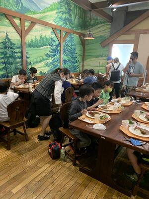 午前中、「ルスツリゾート」でたくさん遊びました。昼食は「ハンバーグカレー」。みんな食欲もあり元気です。レストランに入った途端に雨が降り出しました。「てるてる坊主」のおかげです。