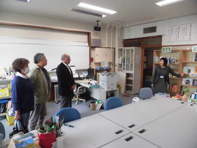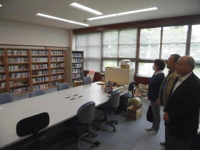 現在改装中の図書室もご案内し、本校職員が作った木のぬくもりを感じさせる書棚等も見ていただきました。