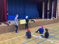 昨年も紹介いたしましたが、本校では全校で体力テストを実施しています。その体力テスト実施に向けて、中学生が体力テストの種目ごとに小学生に対して説明し、日常的なトレーニングや種目のコツを教える時間があります。まずは、今年の体力テストのテーマは・・・。