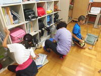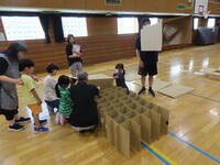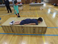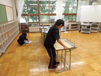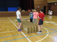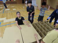 その後、市危機管理課の方に「段ボールベッド」の作り方を教わり、実際に「段ボールベッド」をつくる体験をしました。小1~中3までの児童生徒が協力してベッドを作りました。