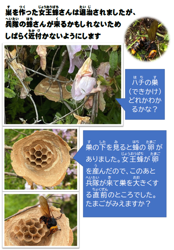 巣は駆除されましたが、他の蜂が来る可能性があるため、近づかないように指導しています。