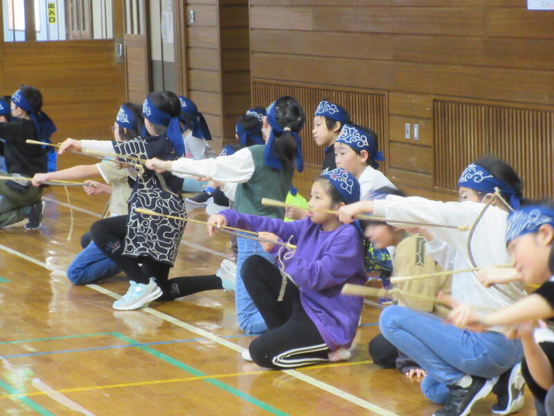 2月28日(水)に、26日に次ぎ、4年生を対象に2回目のアイヌ民族についての学習が行われました。今回も、千歳アイヌ文化伝承保存会会員の方々に来ていただき、教えていただきました。ムックリなどの楽器の演奏の様子を見たり、座り歌に挑戦したり、弓矢を射ったりなど、様々な体験を行い、アイヌ民族に対する理解を深めることができました。