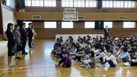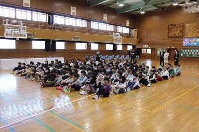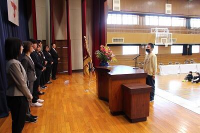 新しく着任された先生方と初めてのご対面。児童の皆さんの素敵な笑顔と、大きな歌声、前児童会書記による温かい歓迎の言葉をもらい、少しばかり緊張ぎみの着任された先生方の表情が緩みました。