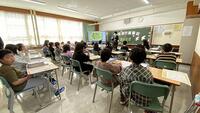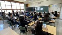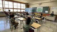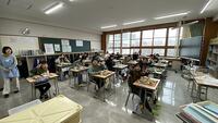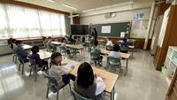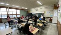 6年生教室では、日本の祝日についての学習をしたり、笑顔でおいしそうに給食を食べていました。