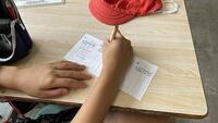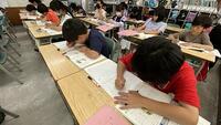 その後はプレテストが配られ、まずは表面の半分が出来たら、先生の所へ〇つけしてもらいに行列ができます。全部丸が付いたら、残って半分の問題をやって、また先生の所へ〇を付けてもらいます。