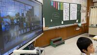 担任の先生は前回の復習として、スマホで撮影した画面を使って前回の授業内容を共有しました。子どもたちはその内容を振り返った後、グループに分かれて記事の構想を話し合い始めました。