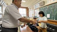 【1年生 国語の授業】 ちょうどプリントを後ろに配る時でした。「はいどうぞ」と後ろを向いて渡していました。