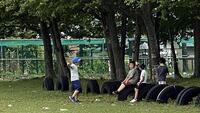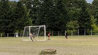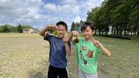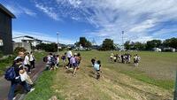 【中休み グラウンドにて】 サッカーをしたり、農園に行って様子見たりする子がいました。栗がたくさん落ちていますね。