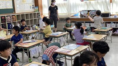 さらに、朝の時間には絵本の読み聞かせも行っていただき、子どもたちは興味津々で身を乗り出して話に耳を傾けています。図書室に足を運ぶ児童が増え、図書委員の子どもたちも本の貸し出し準備に活躍しています。