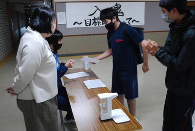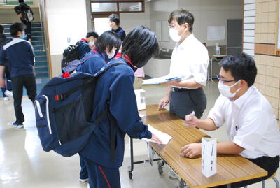 朝は、健康チェックと体温測定、手指消毒を行います。