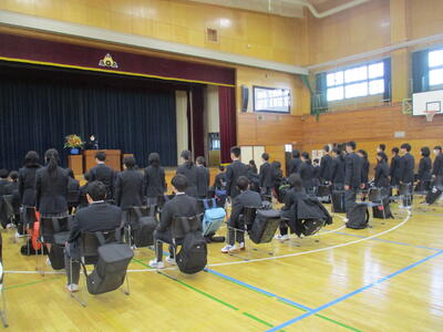 明日の始業式・入学式を前に、生徒がワーク販売で登校しました。新3年生は来週、修学旅行に行きますので各自で準備を進めています。新2年生はクラス替えもあり、学級発表では驚きや喜びの声が響いていました。新1年生は期待と緊張の中、新しい制服に身を包み、ワーク購入後に体育館で入学式の練習をしました。明日の皆さんの登校を楽しみにしています。
