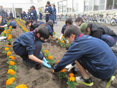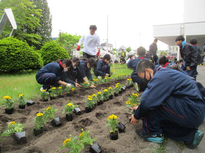 5月23日に環境委員を中心に、各クラスからボランティアを募り、花壇づくりを行いました。