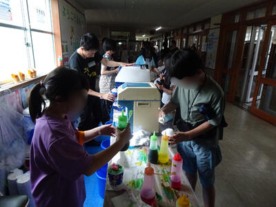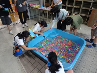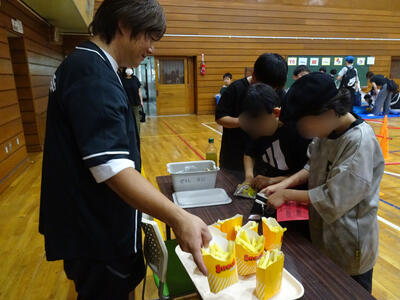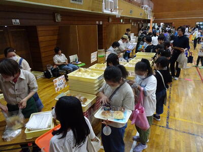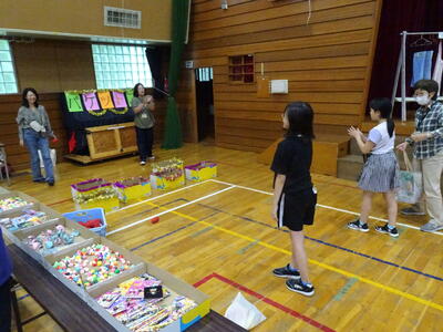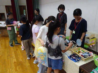 今年度は、実行委員会からは「バケツトス、輪投げ、かたぬき、スーパーボールすくい、くじびき、ヨーヨー」、手芸部からは「エプロン、三角巾、ランチョンマット、巾着、はしぶくろ、道具袋、体育バック、ヘアアクセサリー、スケートカバー」のおやじの会から「焼き鳥・綿あめ・かき氷・ラーメン・フライドポテト」、また「パン工房ゆみなさん」「公立千歳科学技術大学さん」「晴レルモキッチンさん」なども本行事に協力して下さり、多くの出店がありました。