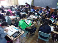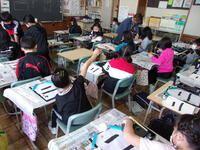 3年生になると新しい学習が始まります。習字もそのうちのひとつです。今日は2つのクラス共に習字の学習の第1回目でした。慎重に用具を準備し、筆を使って「二」の字を書きました。みんな真剣に取り組んでいました。みんなとても成長していますね。
