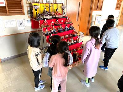 休み時間には子どもたちがひな人形の前に集まり、うっとりと眺めています。