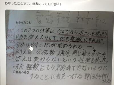 まとめとしては、「もう約分ができないくらいの小さな整数にするとよい。」になりました。