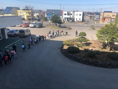 分団ごとに集まり、「集団下校のねらい」「通学路の危険箇所・気になるポイント」を確認後、担当教職員が引率して、それぞれ分団長を先頭に整然と下校しました。