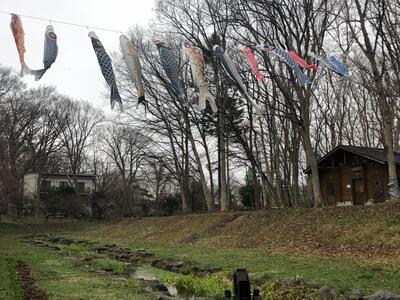 「勇舞川の上空を元気に泳ぐこいのぼり」