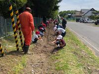 4年生が「桜寿会(おうじゅかい、自由ヶ丘老人クラブ、会員平均年齢81歳)」のみなさんと一緒に、校地西側の道路わきに、コスモスの種を植えました。