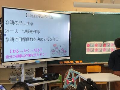4年生は学級活動の時間に、卒入学式の装飾づくりに取り組んでいました。