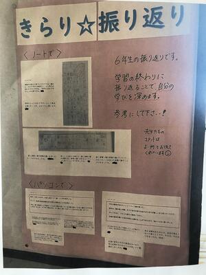 ふりかえりの質を向上させようと、よい記述を廊下の掲示物でよびかけています。